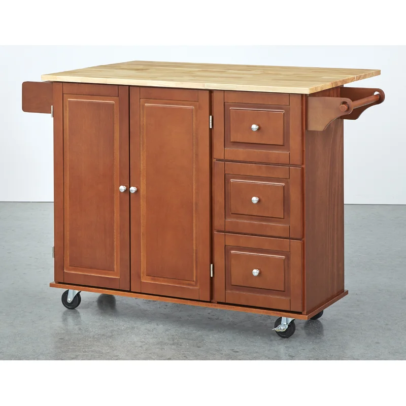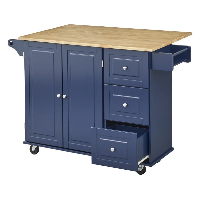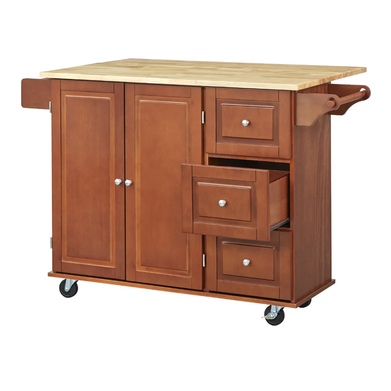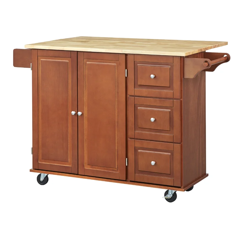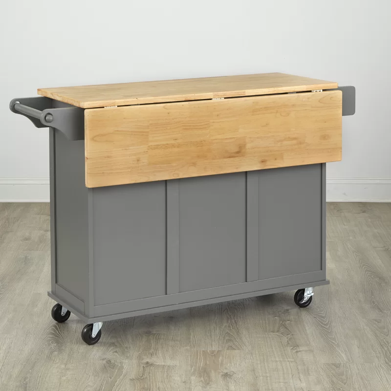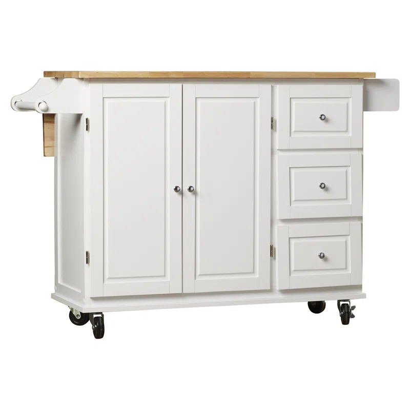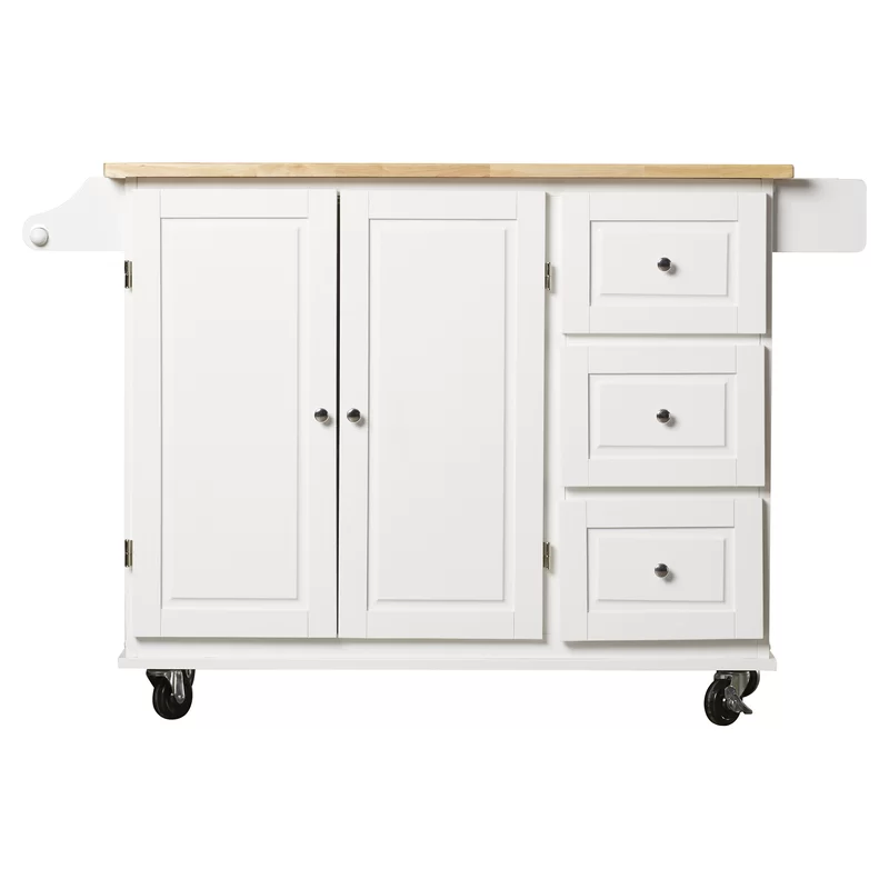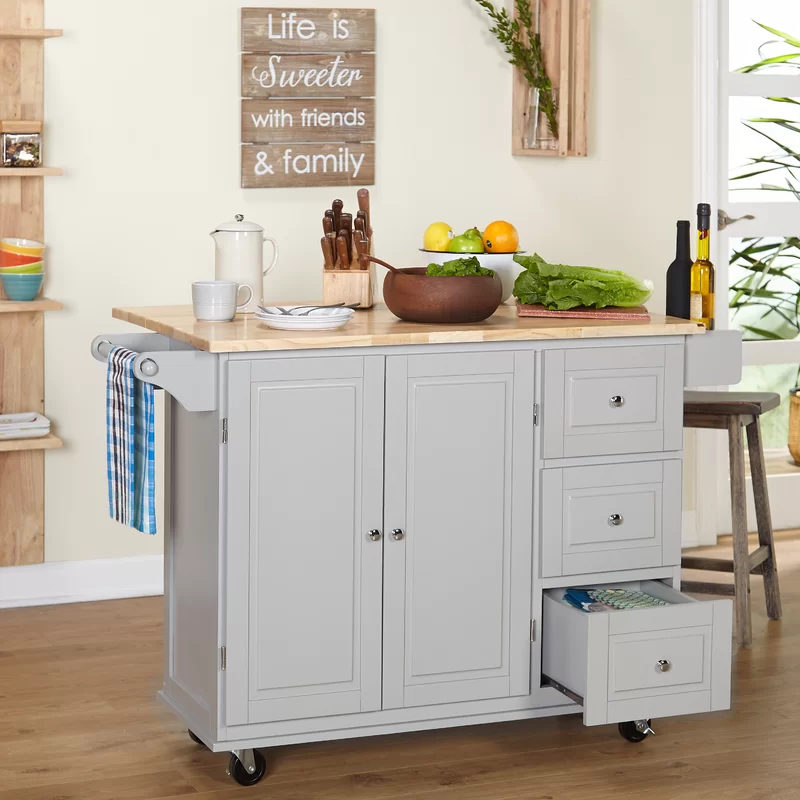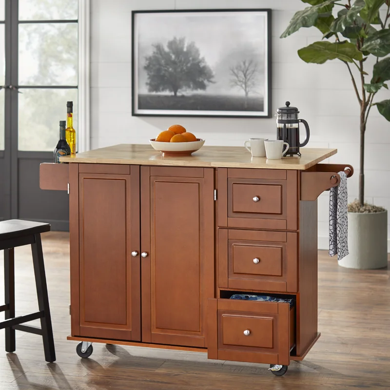 This rolling kitchen cart is the right piece for adding extra chopping, cooking, and serving space in your kitchen. Crafted from engineered wood with the finish of your choice, this cart showcases three drawers and a single cabinet with two doors that are ideal for storing away cutlery, napkins, cookware and cook books. We love how the inset paneling on the fronts give this piece a traditional look. This cart features a natural solid wood countertop with a drop-down leaf that adds additional surface space. It also comes with a built-in rack on the side for towels and utensils. Plus, this cart rests on four removable casters (two are lockable), so it can be moved with ease.