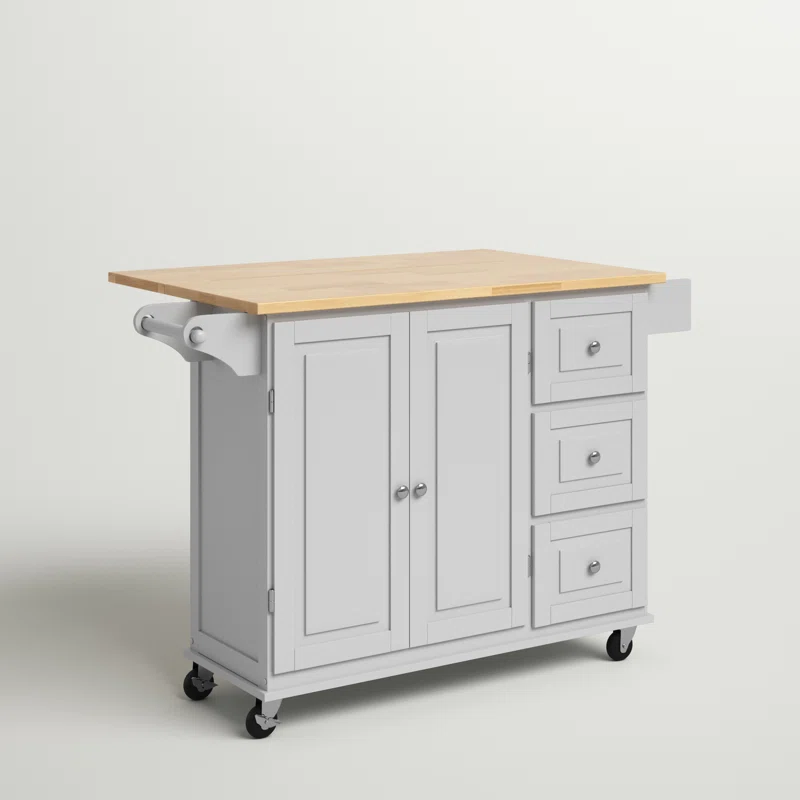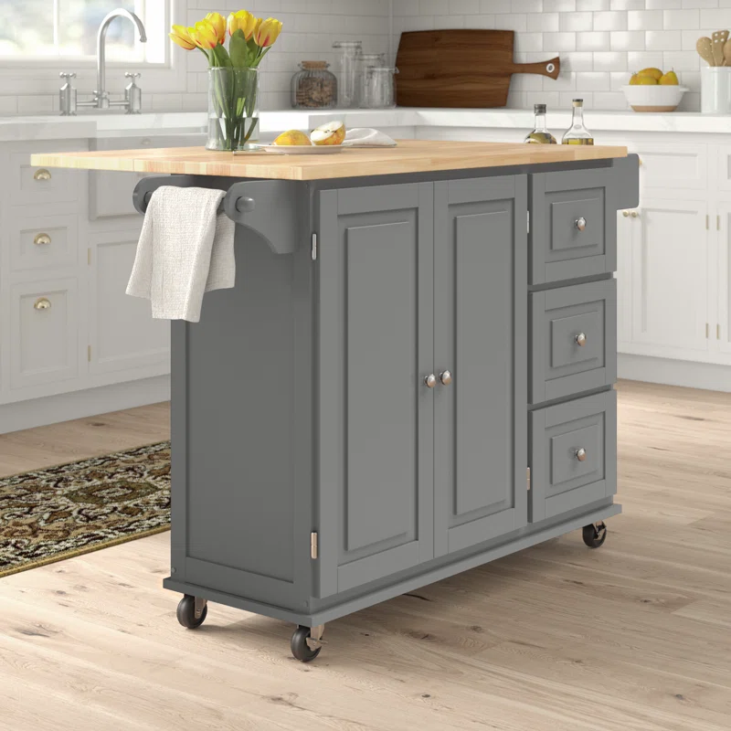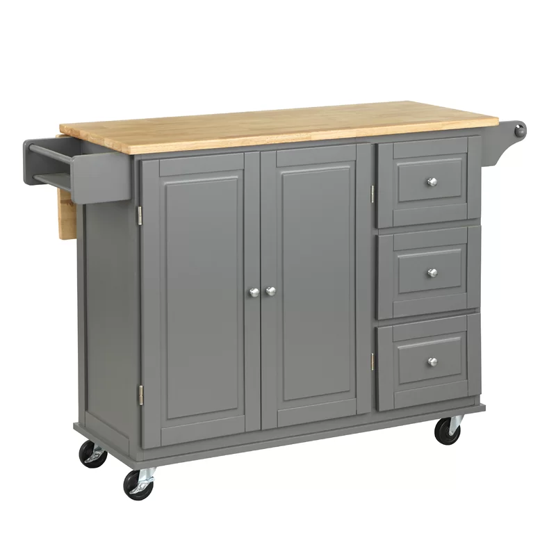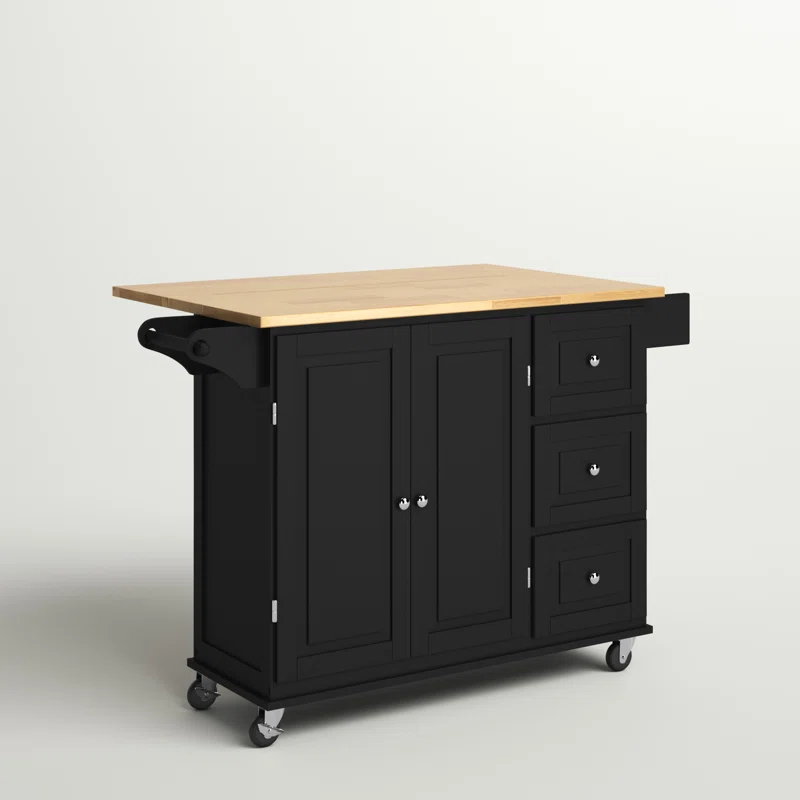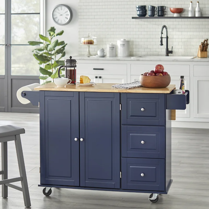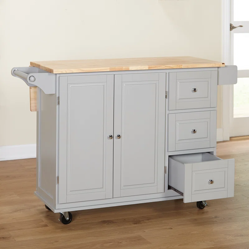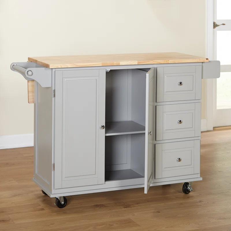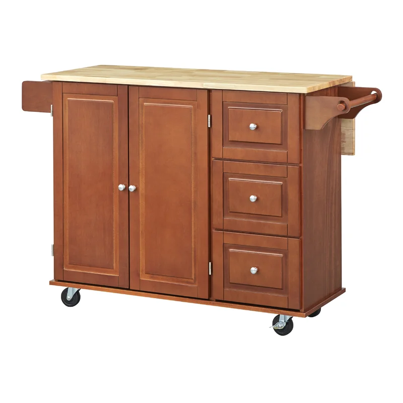 This rolling kitchen cart is the right piece for adding extra chopping, cooking, and serving space in your kitchen. Crafted from engineered wood with the finish of your choice, this cart showcases three drawers and a single cabinet with two doors that are ideal for storing away cutlery, napkins, cookware and cook books. We love how the inset paneling on the fronts give this piece a traditional look. This cart features a natural solid wood countertop with a drop-down leaf that adds additional surface space. It also comes with a built-in rack on the side for towels and utensils. Plus, this cart rests on four removable casters (two are lockable), so it can be moved with ease.