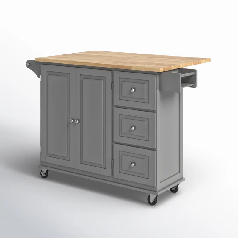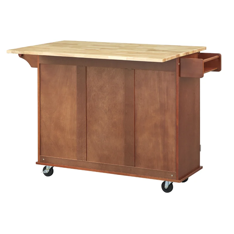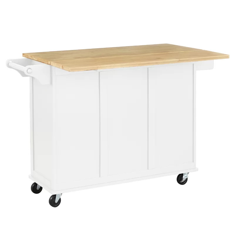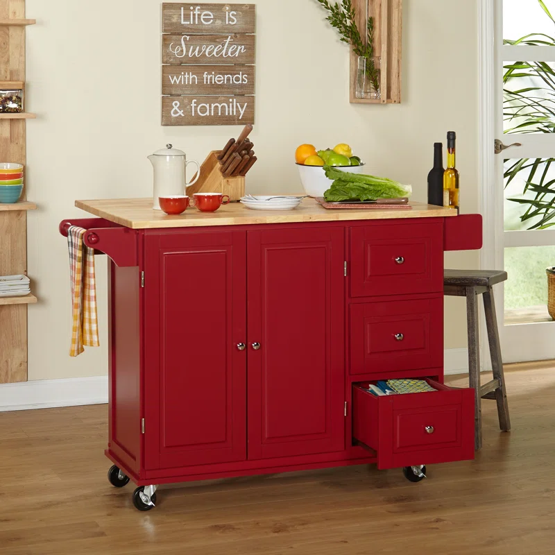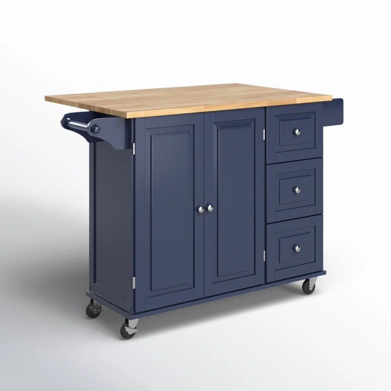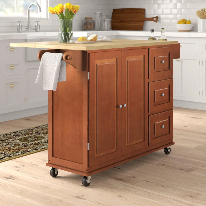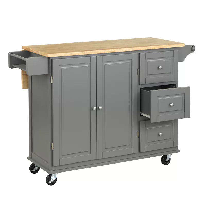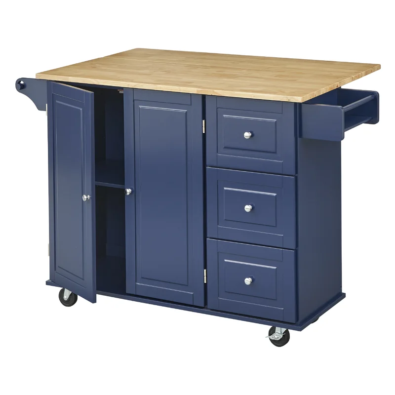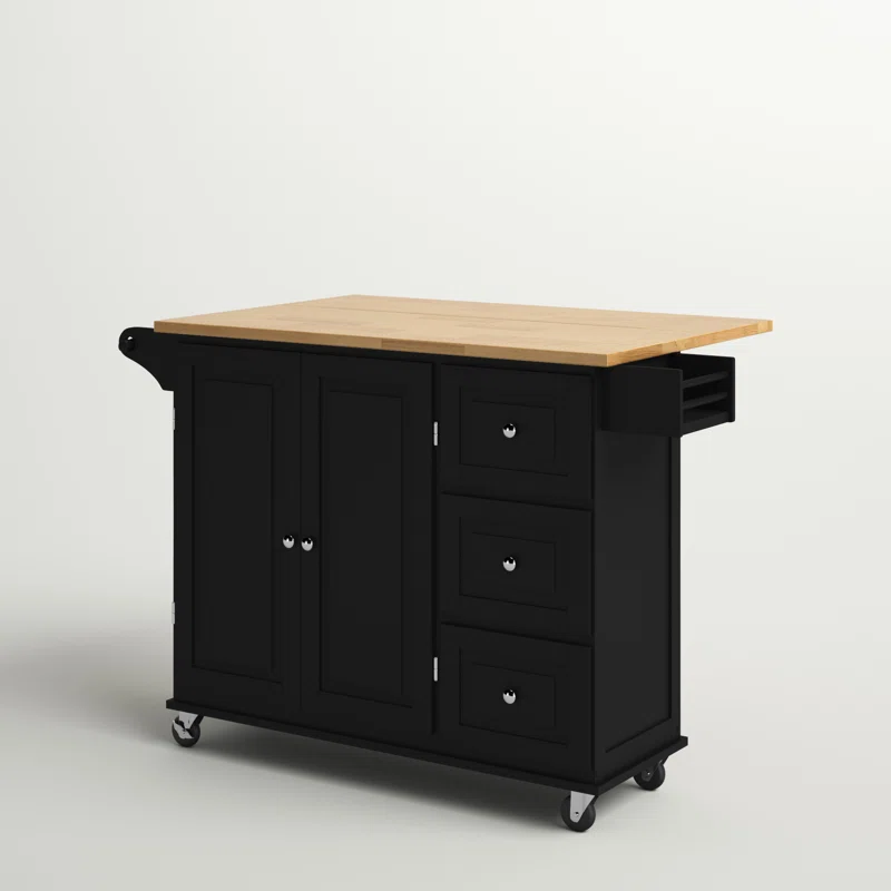 This rolling kitchen cart is the right piece for adding extra chopping, cooking, and serving space in your kitchen. Crafted from engineered wood with the finish of your choice, this cart showcases three drawers and a single cabinet with two doors that are ideal for storing away cutlery, napkins, cookware and cook books. We love how the inset paneling on the fronts give this piece a traditional look. This cart features a natural solid wood countertop with a drop-down leaf that adds additional surface space. It also comes with a built-in rack on the side for towels and utensils. Plus, this cart rests on four removable casters (two are lockable), so it can be moved with ease.