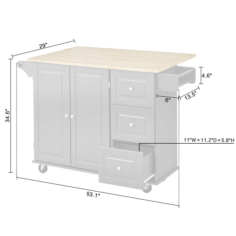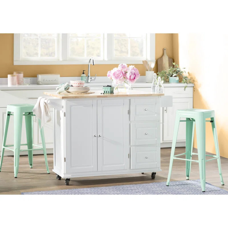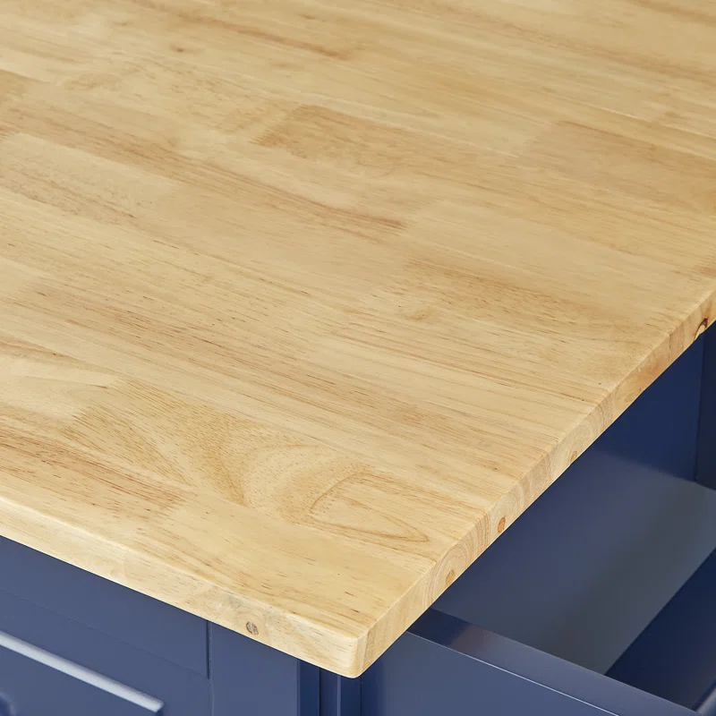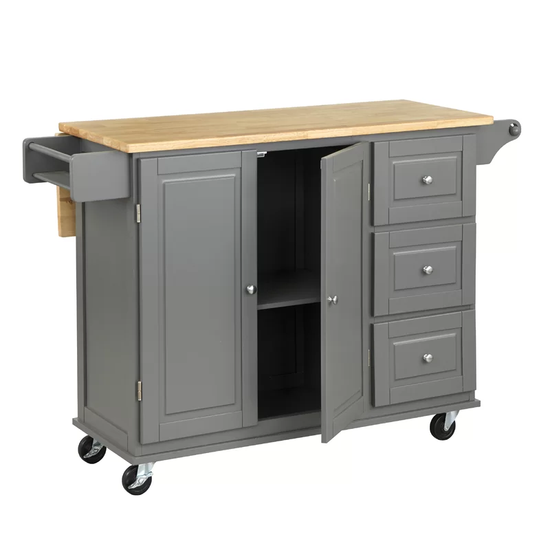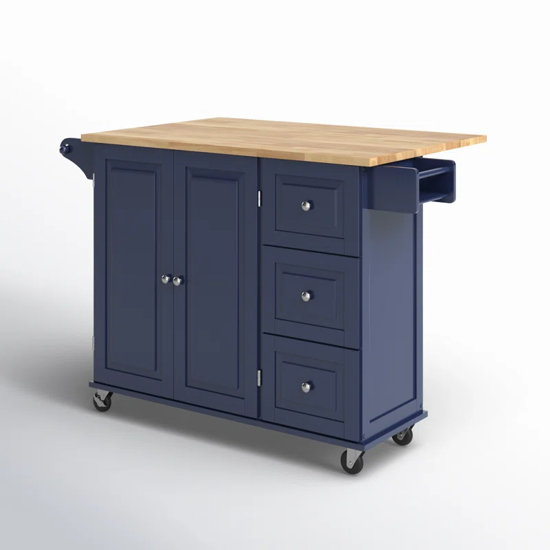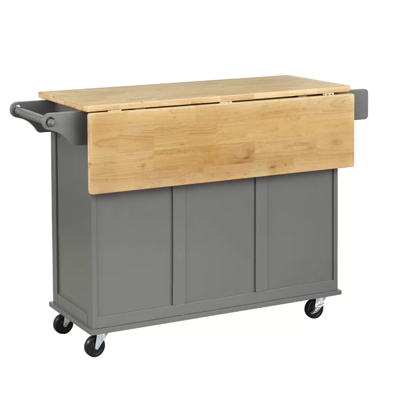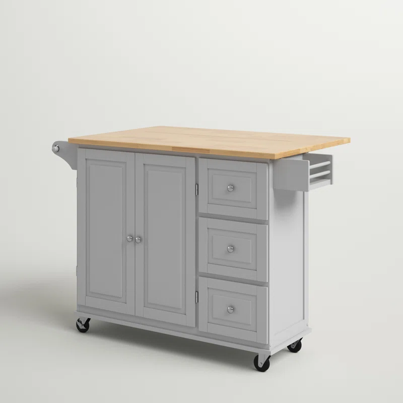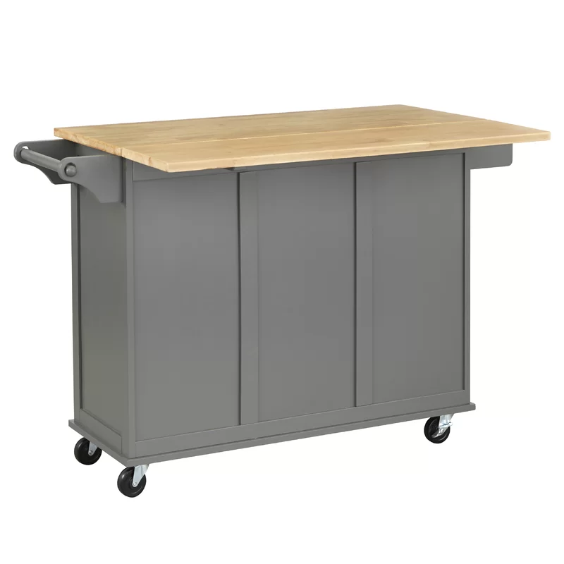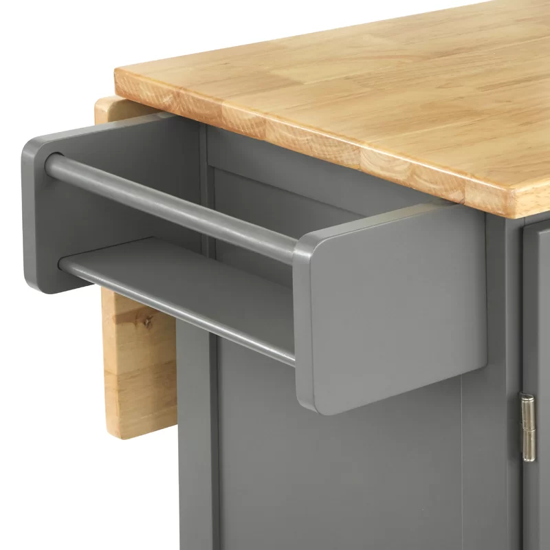 This rolling kitchen cart is the right piece for adding extra chopping, cooking, and serving space in your kitchen. Crafted from engineered wood with the finish of your choice, this cart showcases three drawers and a single cabinet with two doors that are ideal for storing away cutlery, napkins, cookware and cook books. We love how the inset paneling on the fronts give this piece a traditional look. This cart features a natural solid wood countertop with a drop-down leaf that adds additional surface space. It also comes with a built-in rack on the side for towels and utensils. Plus, this cart rests on four removable casters (two are lockable), so it can be moved with ease.