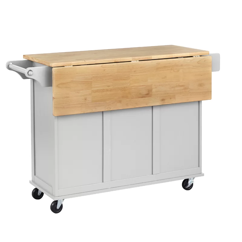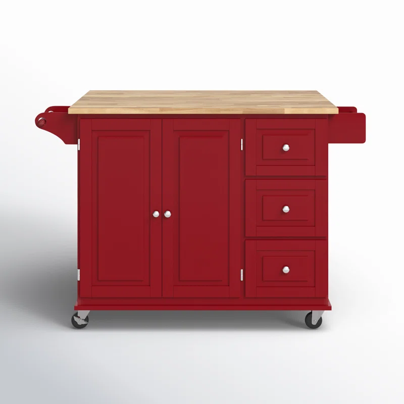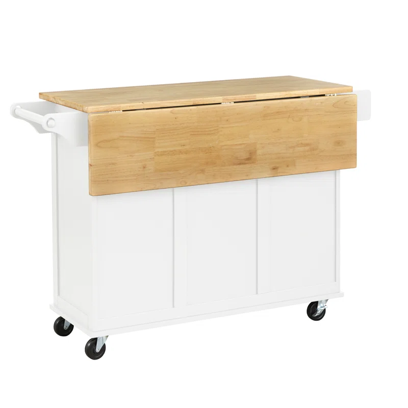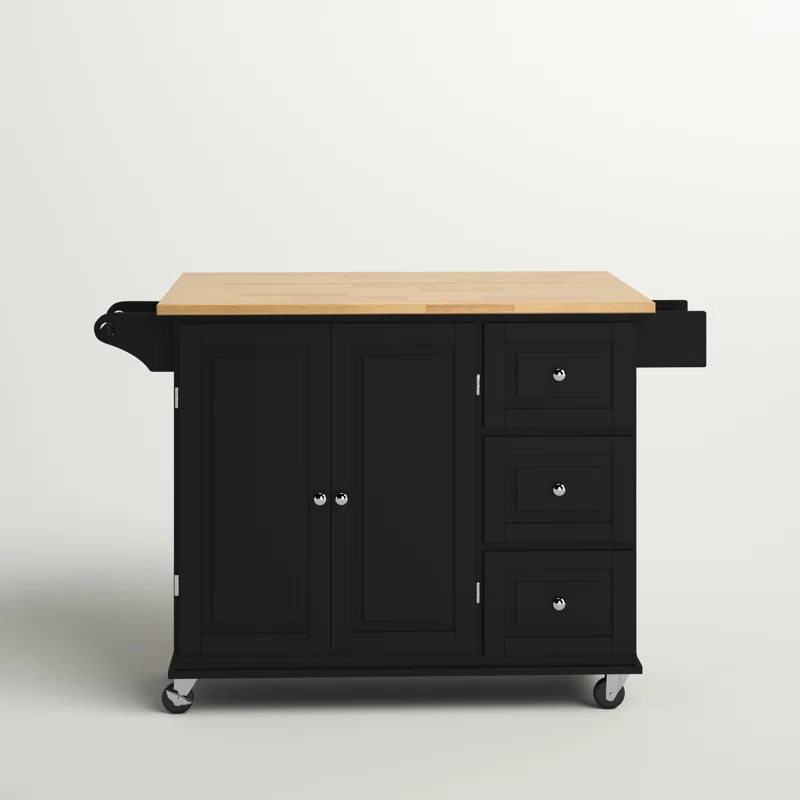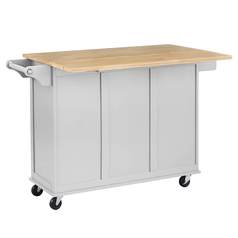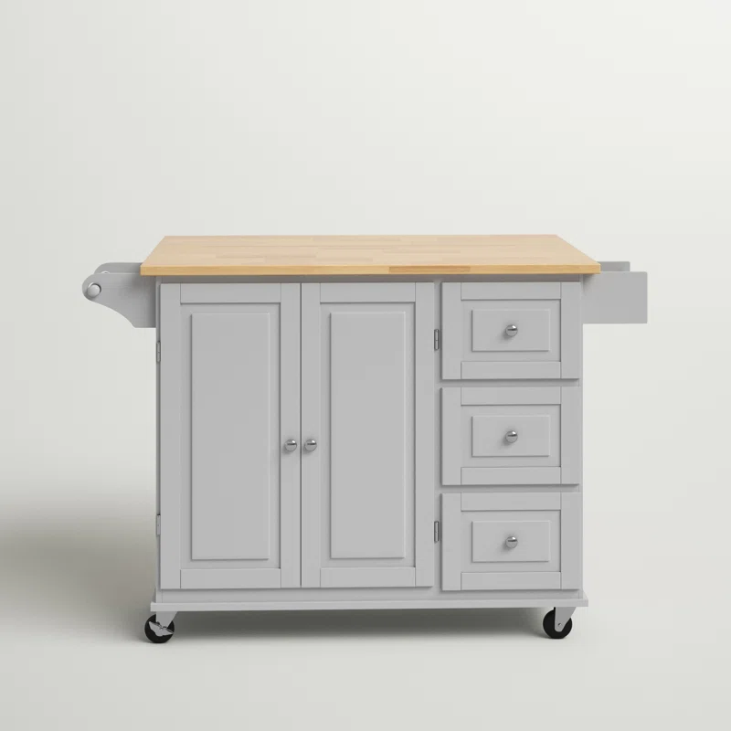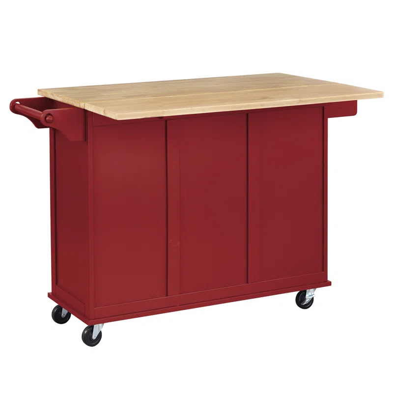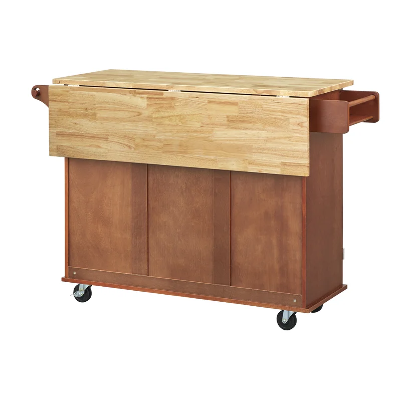 This rolling kitchen cart is the right piece for adding extra chopping, cooking, and serving space in your kitchen. Crafted from engineered wood with the finish of your choice, this cart showcases three drawers and a single cabinet with two doors that are ideal for storing away cutlery, napkins, cookware and cook books. We love how the inset paneling on the fronts give this piece a traditional look. This cart features a natural solid wood countertop with a drop-down leaf that adds additional surface space. It also comes with a built-in rack on the side for towels and utensils. Plus, this cart rests on four removable casters (two are lockable), so it can be moved with ease.