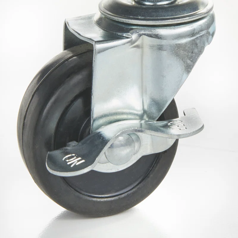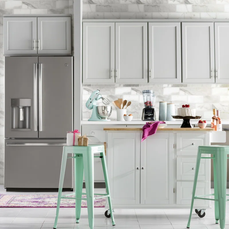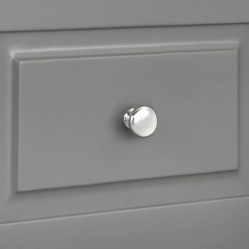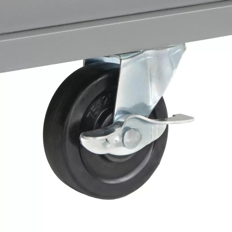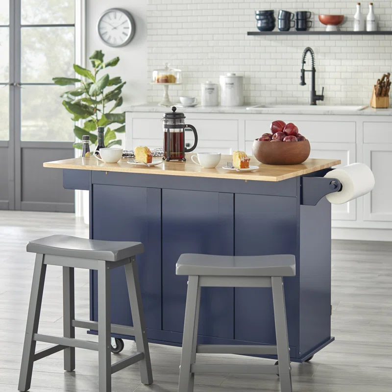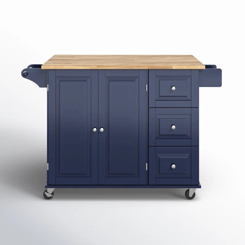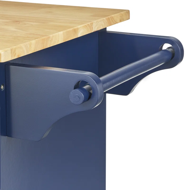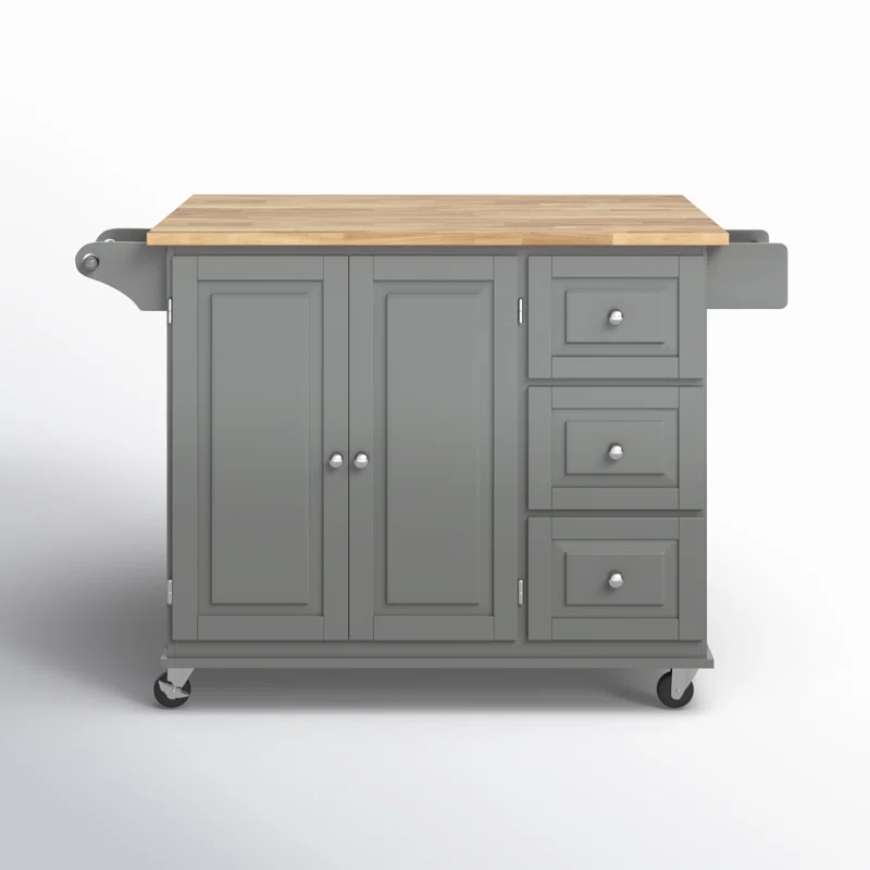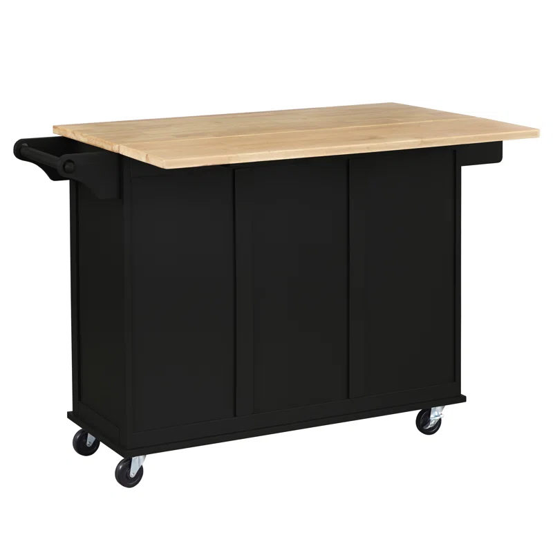 This rolling kitchen cart is the right piece for adding extra chopping, cooking, and serving space in your kitchen. Crafted from engineered wood with the finish of your choice, this cart showcases three drawers and a single cabinet with two doors that are ideal for storing away cutlery, napkins, cookware and cook books. We love how the inset paneling on the fronts give this piece a traditional look. This cart features a natural solid wood countertop with a drop-down leaf that adds additional surface space. It also comes with a built-in rack on the side for towels and utensils. Plus, this cart rests on four removable casters (two are lockable), so it can be moved with ease.