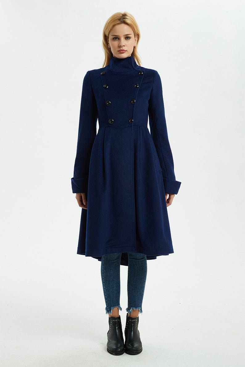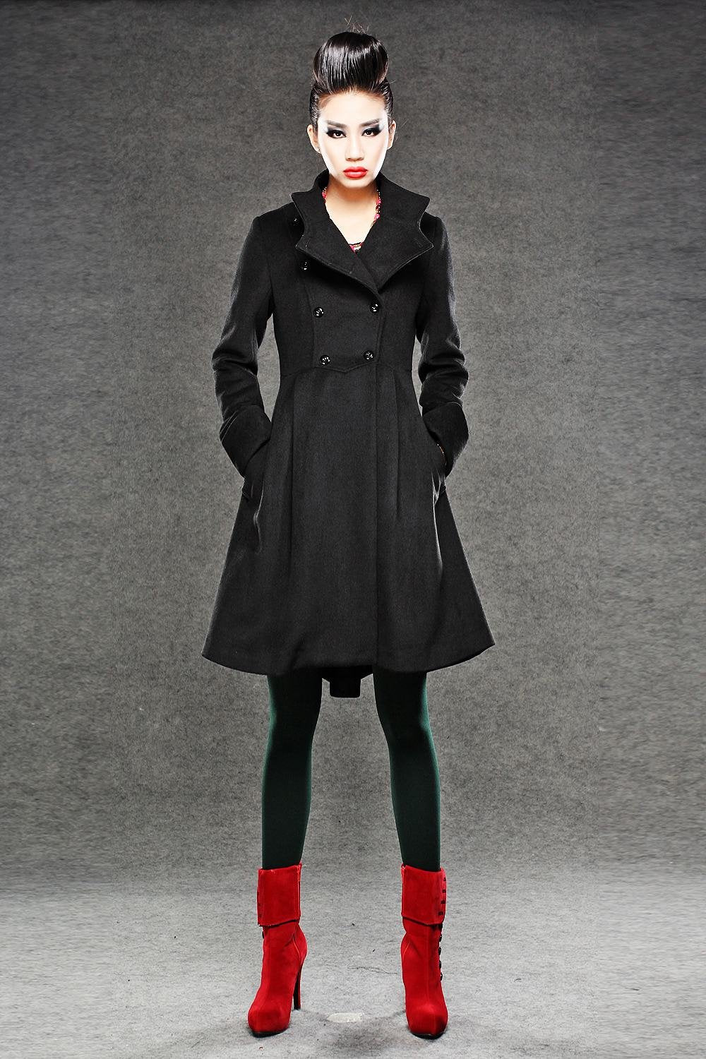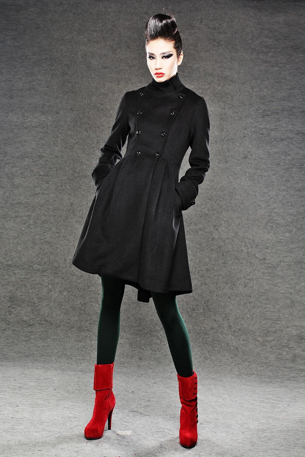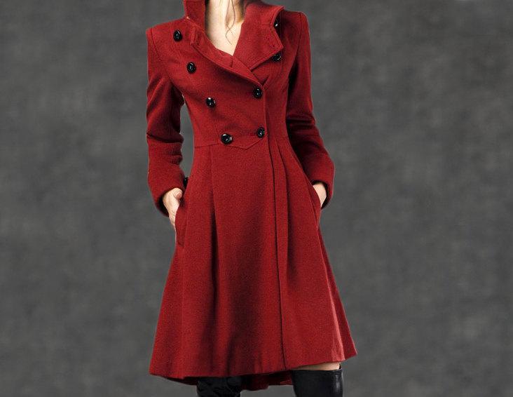 The red Military Coat is made of 60% wool blend, nylon, The wool coat has a red polyester lining. The winter coat is closed by black buttons, the warm wool coat has two side pockets. The red wool coat is a irregular coat, the front length is shorter than the back length.The womens wool coat has a high collar, it has two different style when stand up or not.