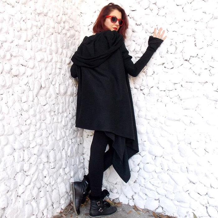 Coat for women with thumbsnail sleeves and extralarge hood. No lining.Light wool blend fabric.